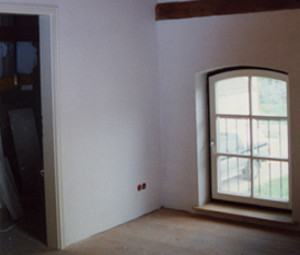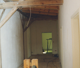 Im Gästehaus wurde die vorhandene Dachstuhlkonstruktion mit in die Gestaltung einbezogen. Den Gemeinschaftsraum krönt ein aus dem Fläming typischen Feldsteinen errichteter rustikaler Kamin.